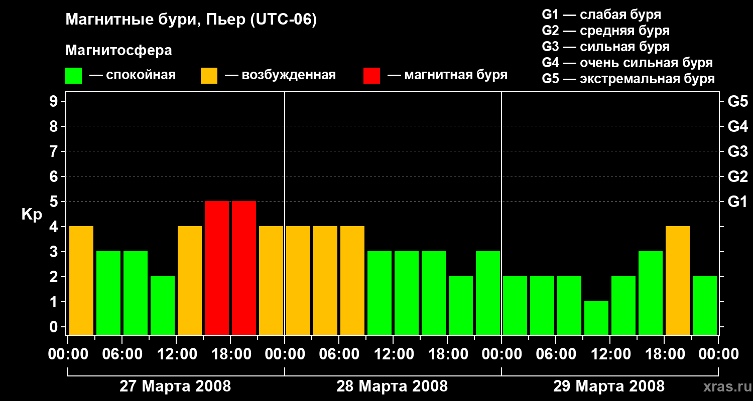 Изменения геомагнитного индекса Kp с 27 по 29 марта 2008 года для средних широт