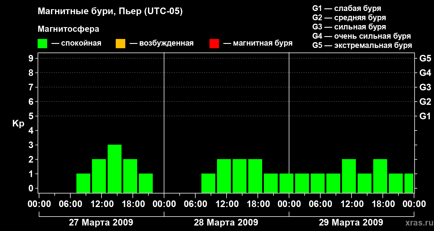 Изменения геомагнитного индекса Kp с 27 по 29 марта 2009 года для средних широт