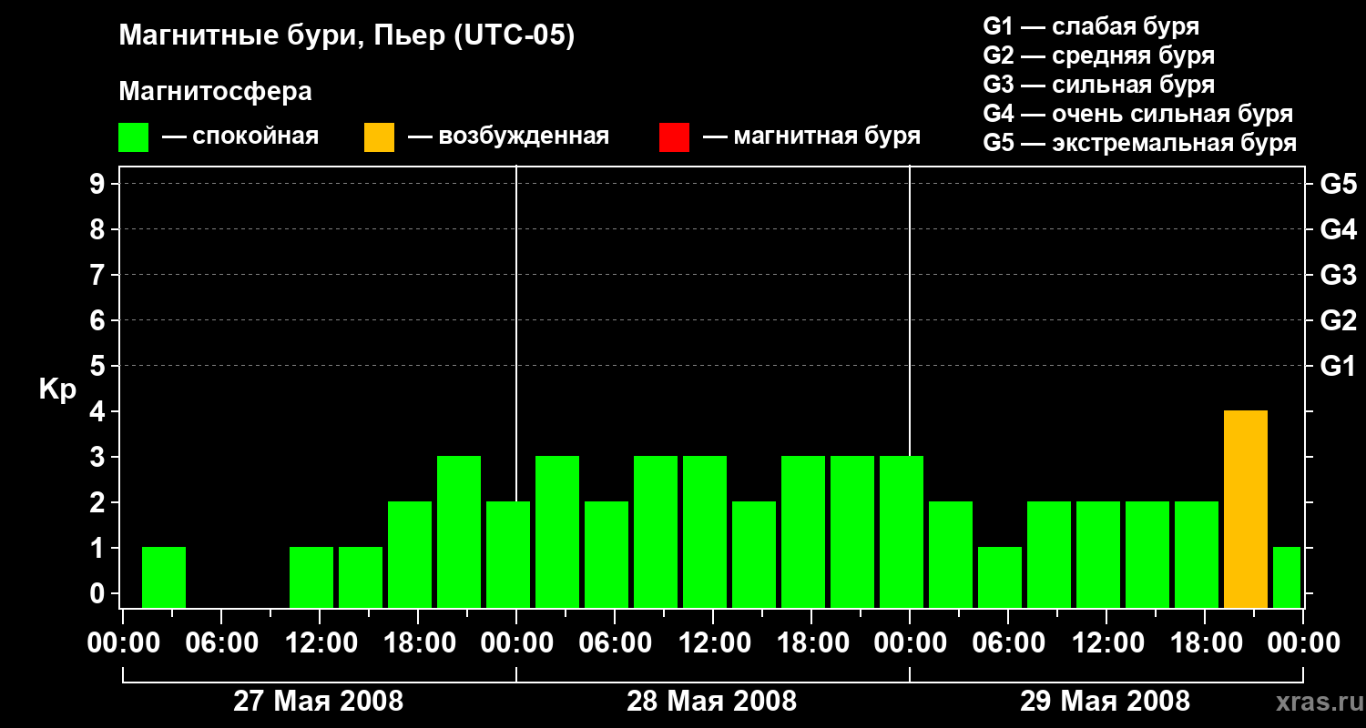Изменения геомагнитного индекса Kp с 27 по 29 мая 2008 года для средних широт