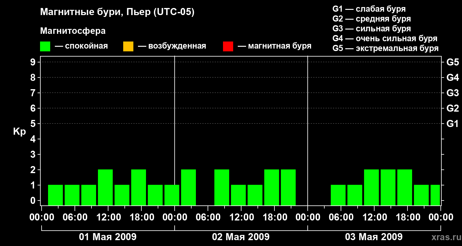Изменения геомагнитного индекса Kp с 1 по 3 мая 2009 года для средних широт