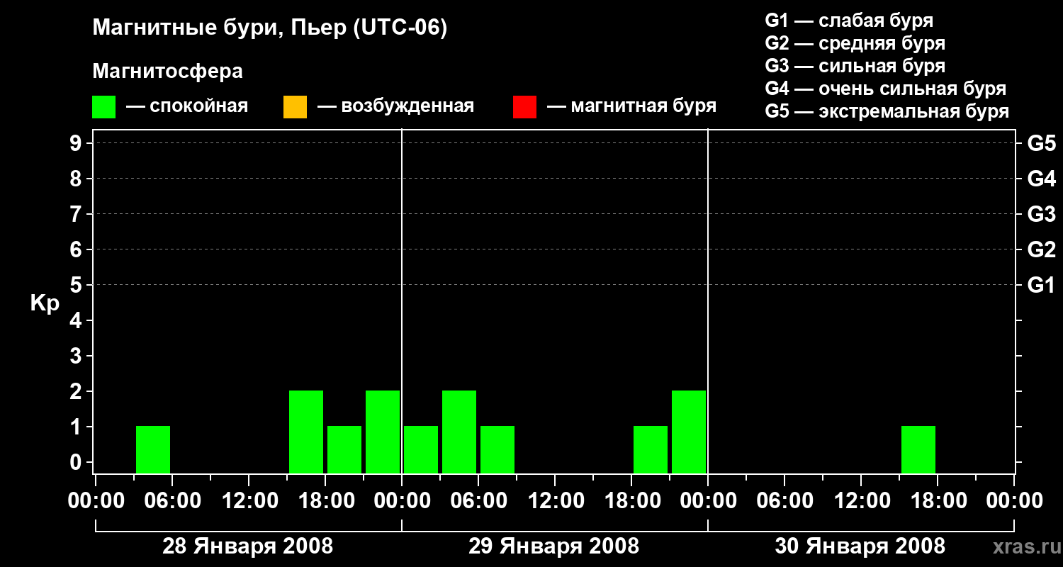 Изменения геомагнитного индекса Kp с 28 по 30 января 2008 года для средних широт