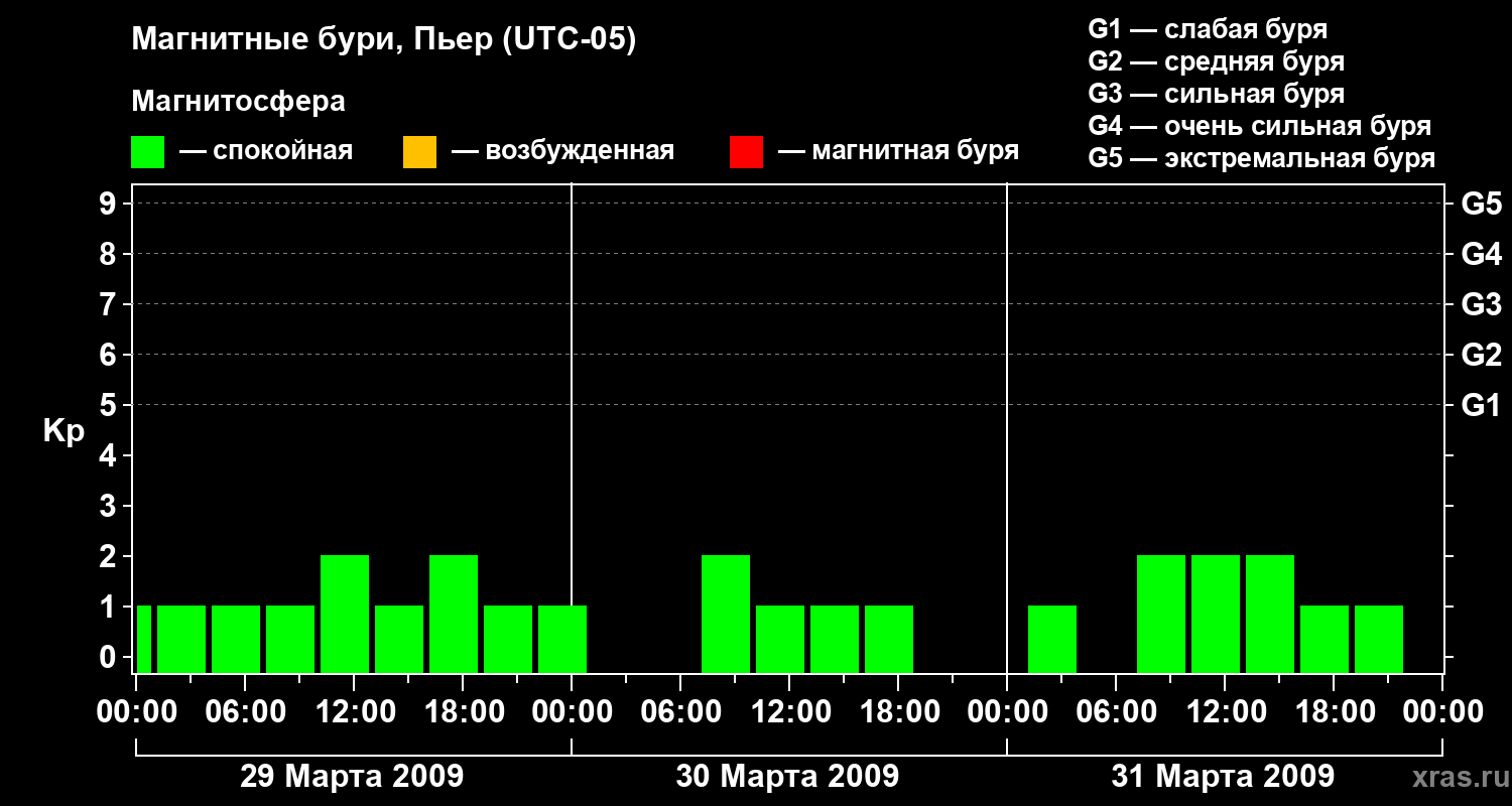 Изменения геомагнитного индекса Kp с 29 по 31 марта 2009 года для средних широт