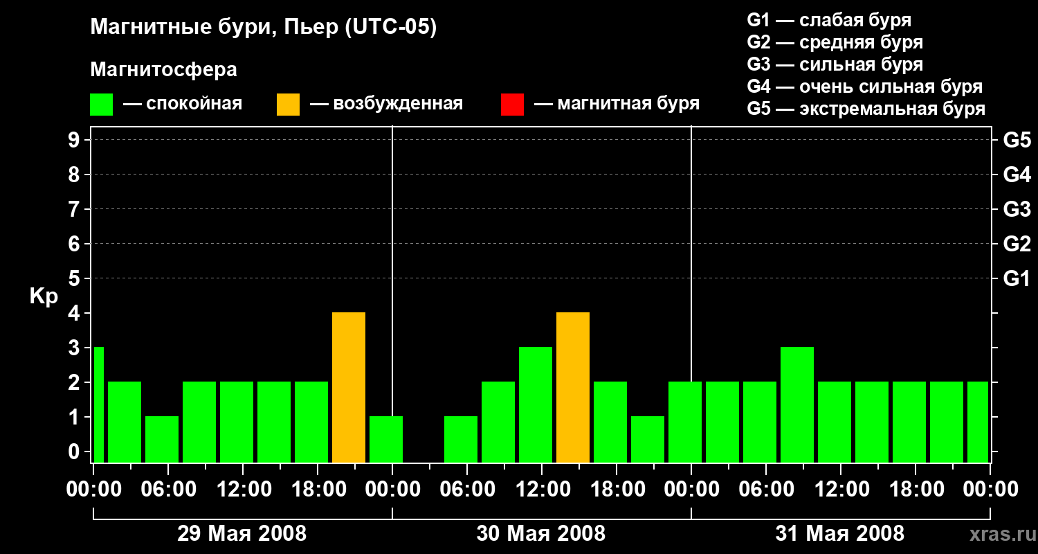 Изменения геомагнитного индекса Kp с 29 по 31 мая 2008 года для средних широт