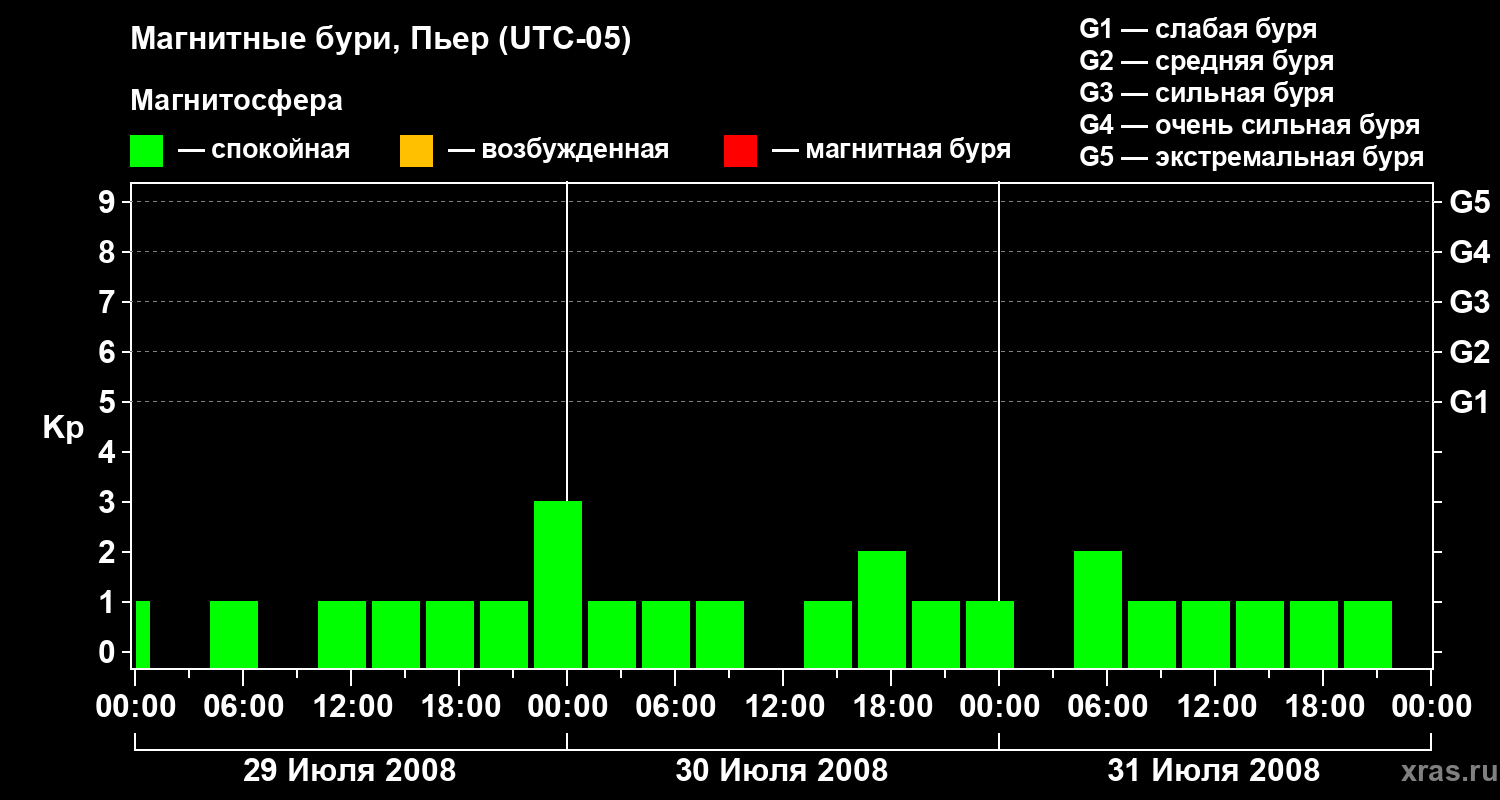 Изменения геомагнитного индекса Kp с 29 по 31 июля 2008 года для средних широт
