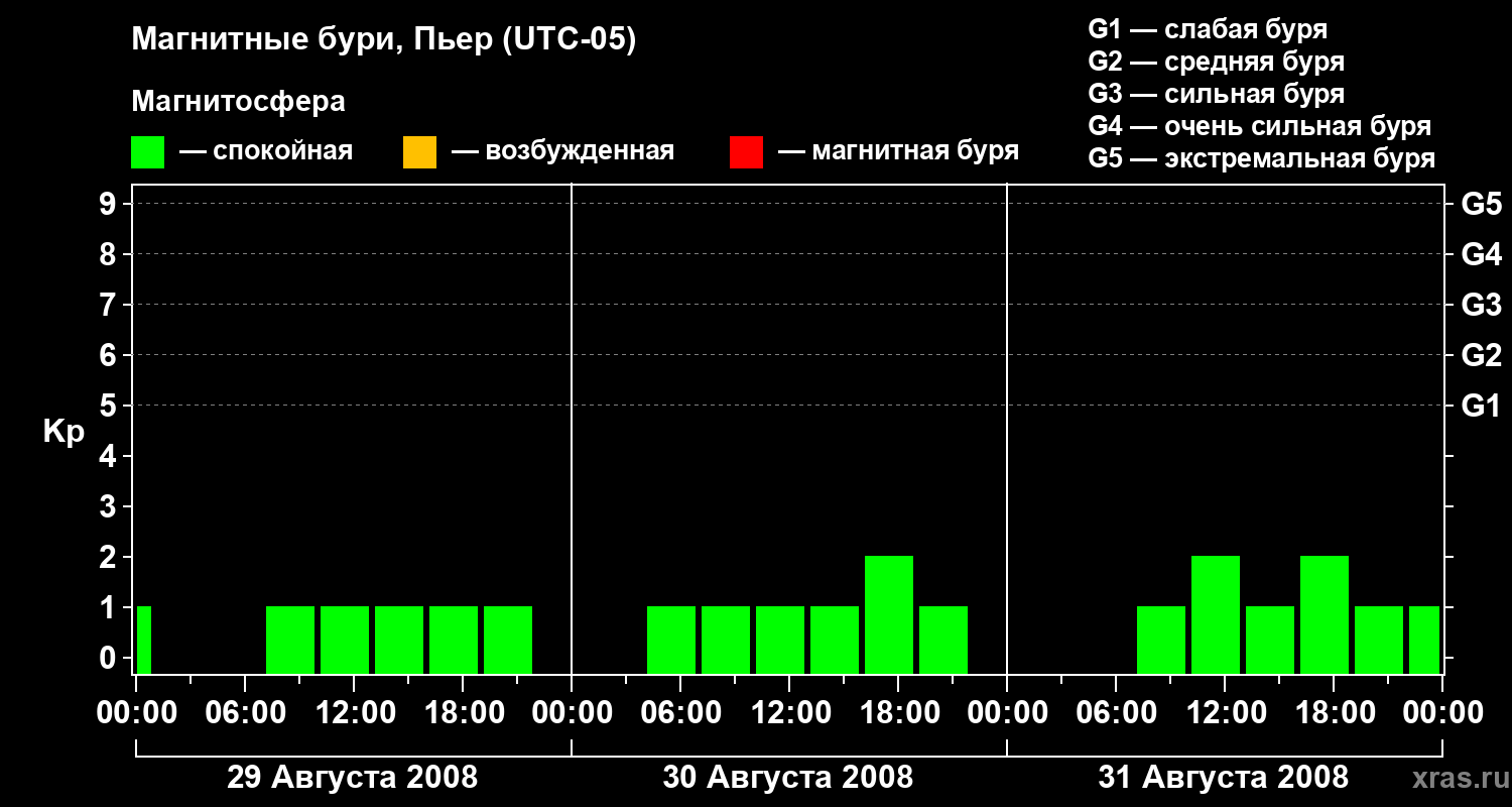 Изменения геомагнитного индекса Kp с 29 по 31 августа 2008 года для средних широт