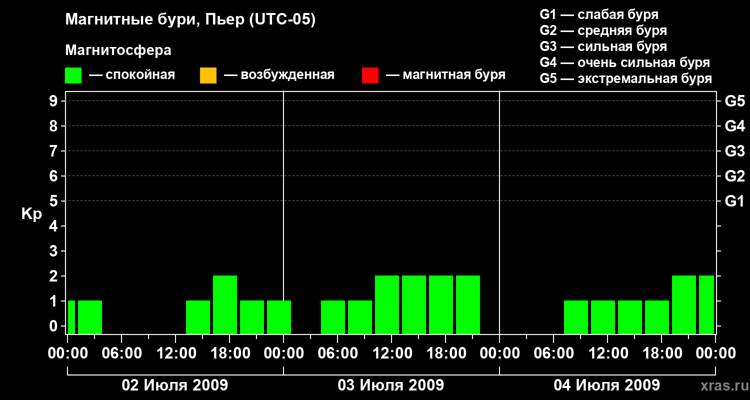 Изменения геомагнитного индекса Kp с 2 по 4 июля 2009 года для средних широт