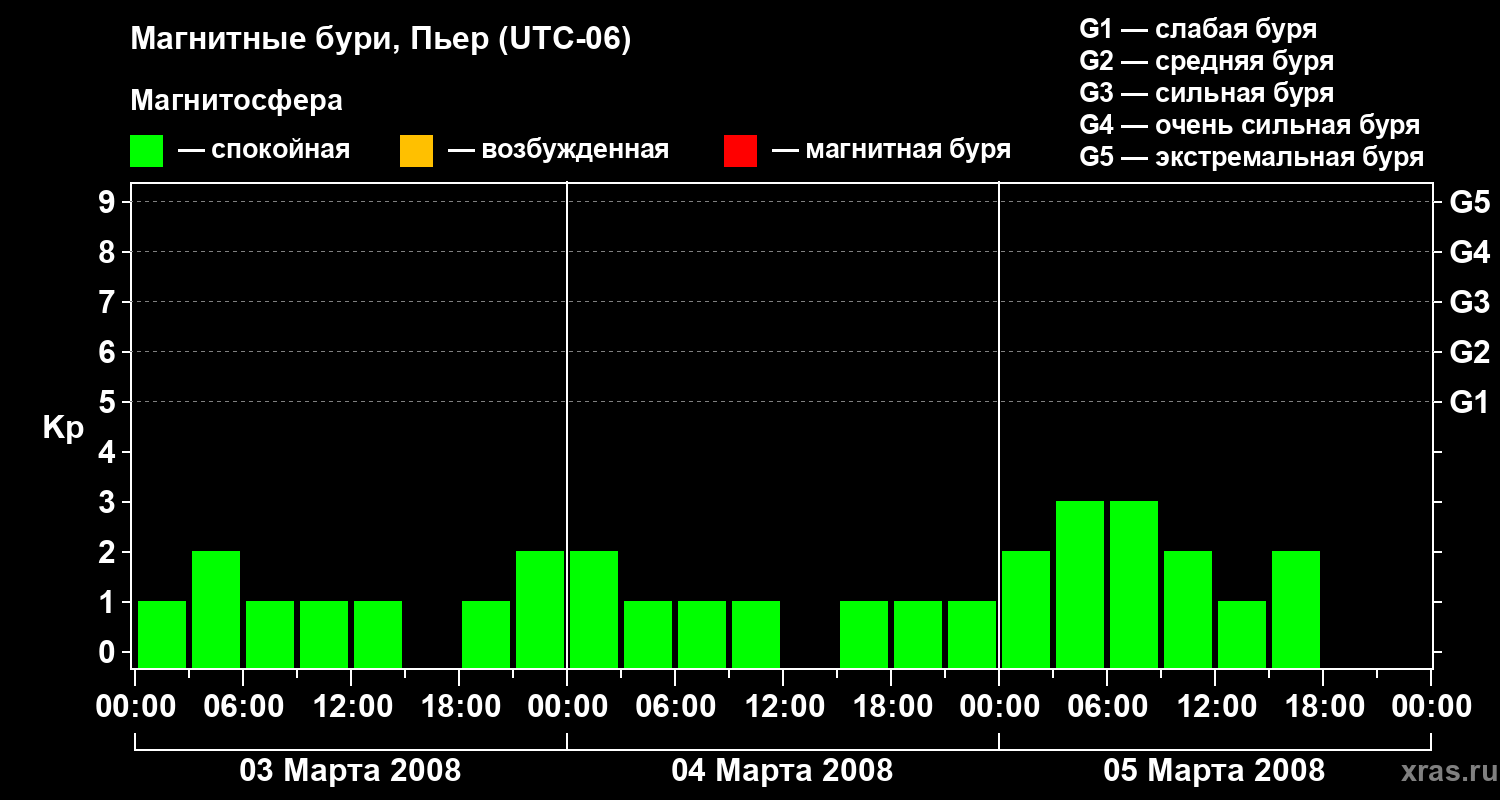 Изменения геомагнитного индекса Kp с 3 по 5 марта 2008 года для средних широт