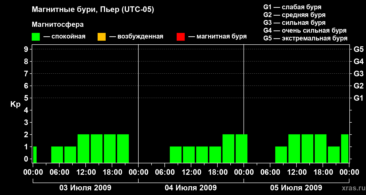 Изменения геомагнитного индекса Kp с 3 по 5 июля 2009 года для средних широт