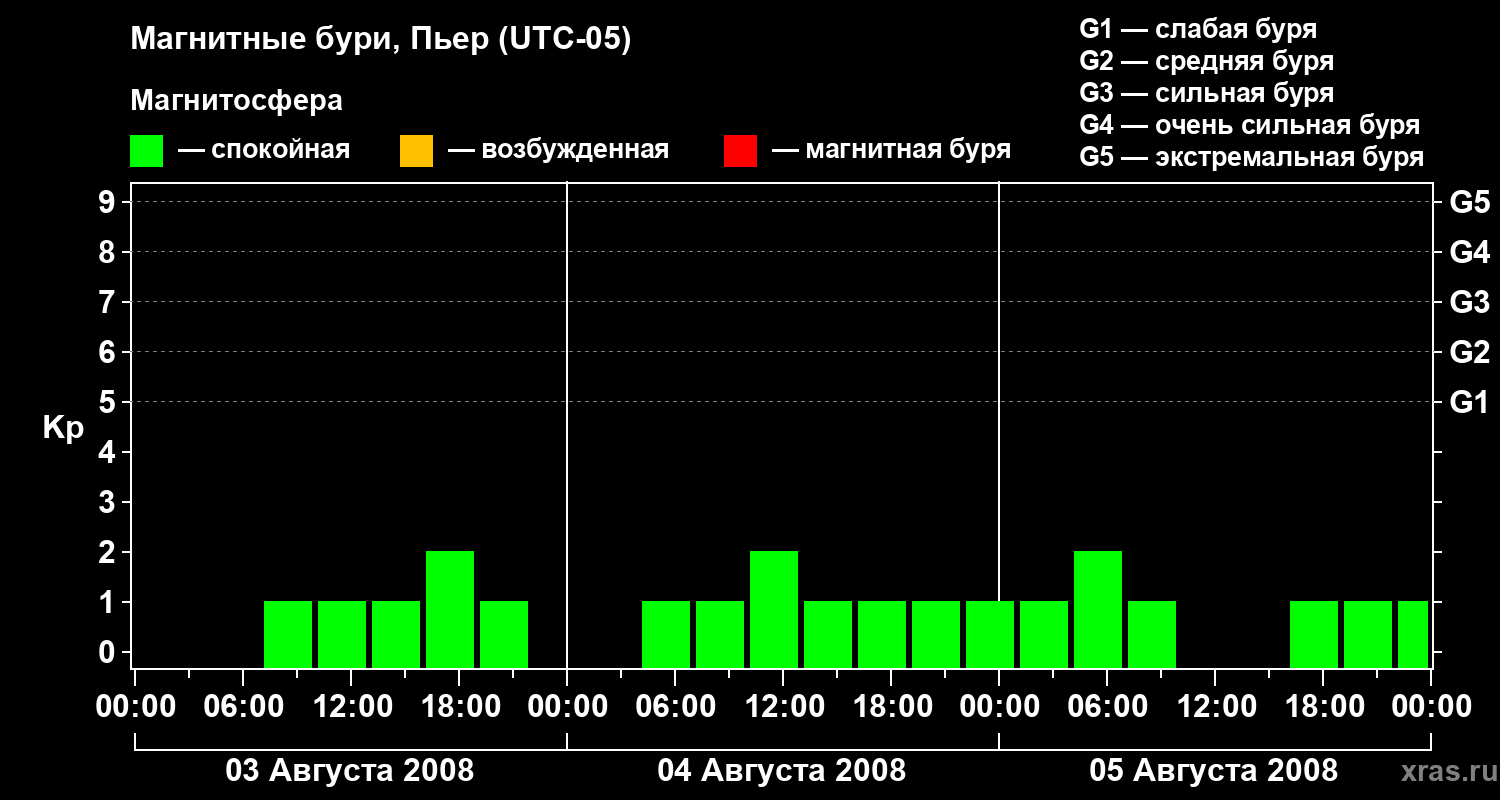 Изменения геомагнитного индекса Kp с 3 по 5 августа 2008 года для средних широт