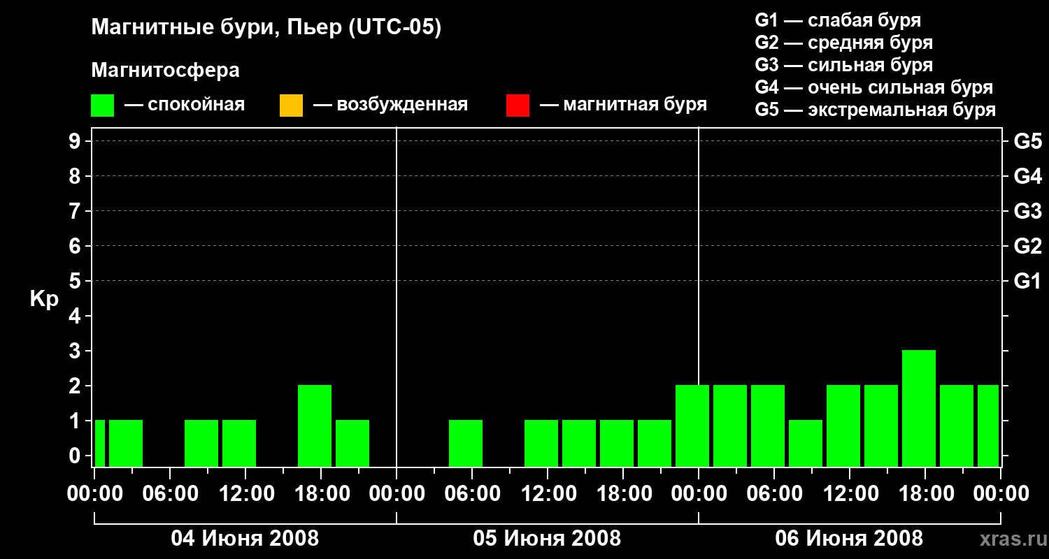 Изменения геомагнитного индекса Kp с 4 по 6 июня 2008 года для средних широт