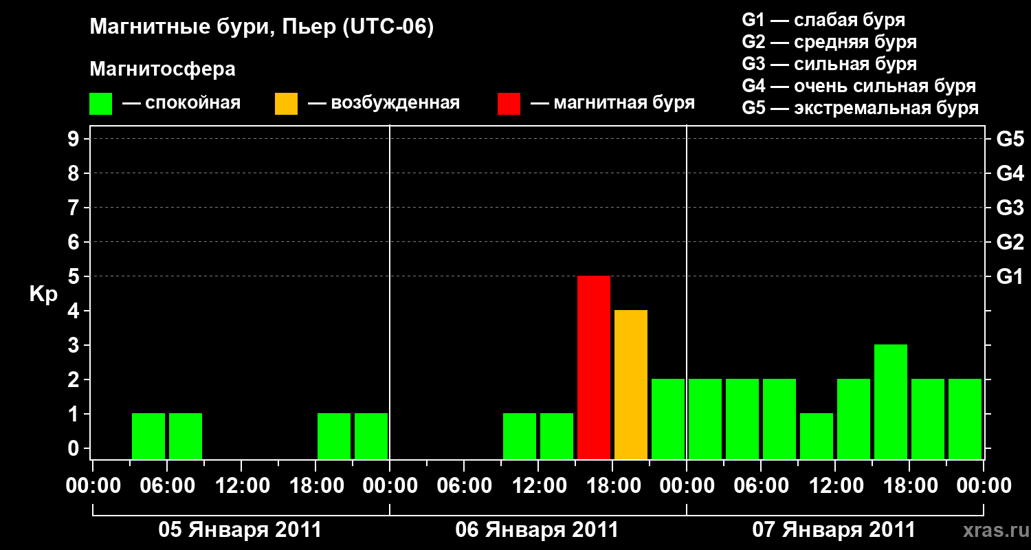 Изменения геомагнитного индекса Kp с 5 по 7 января 2011 года для средних широт