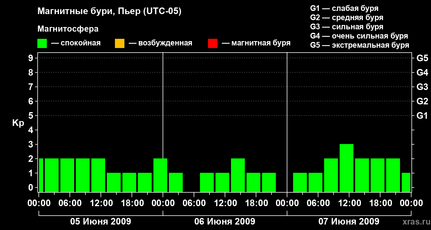 Изменения геомагнитного индекса Kp с 5 по 7 июня 2009 года для средних широт