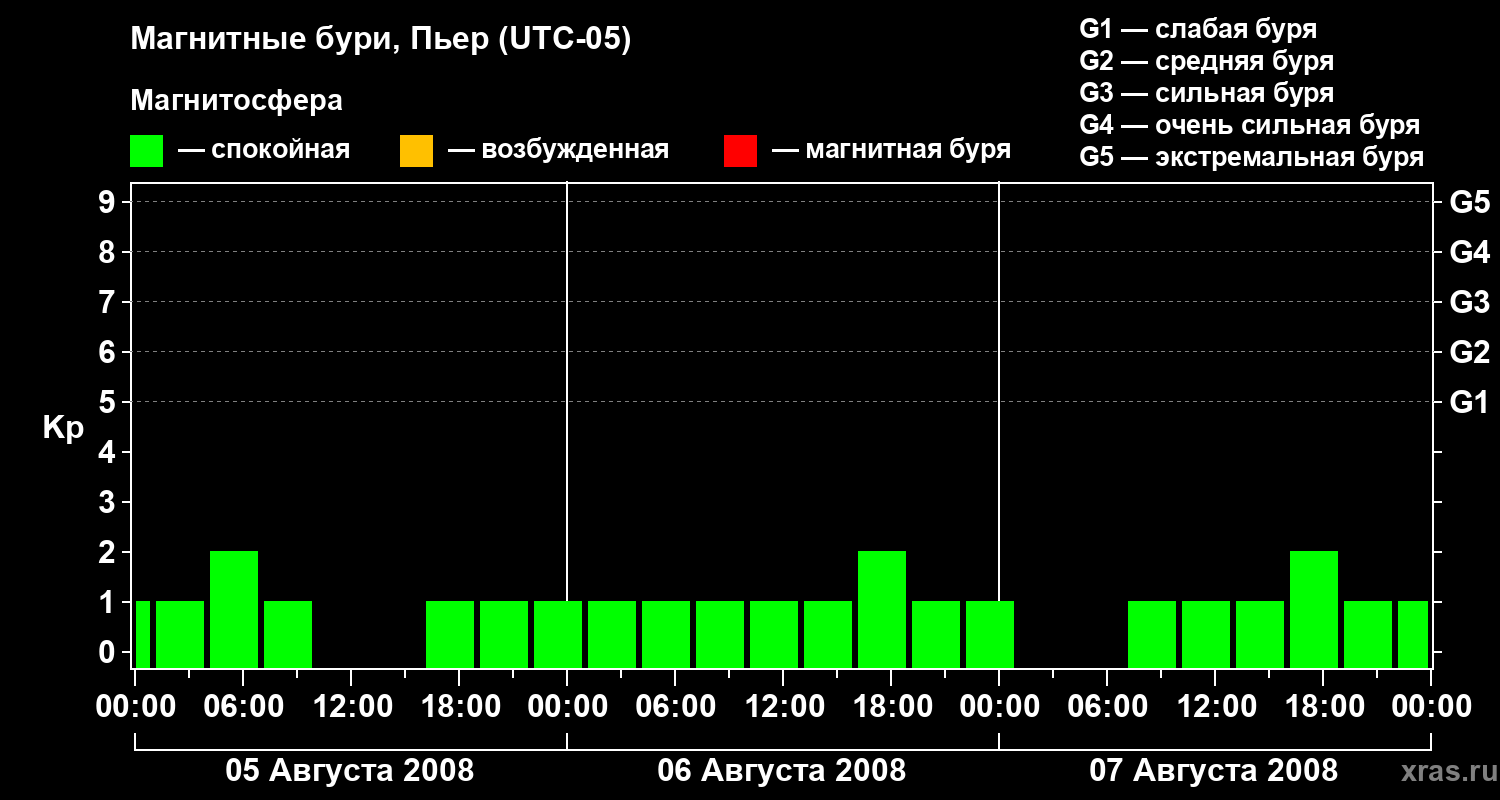 Изменения геомагнитного индекса Kp с 5 по 7 августа 2008 года для средних широт