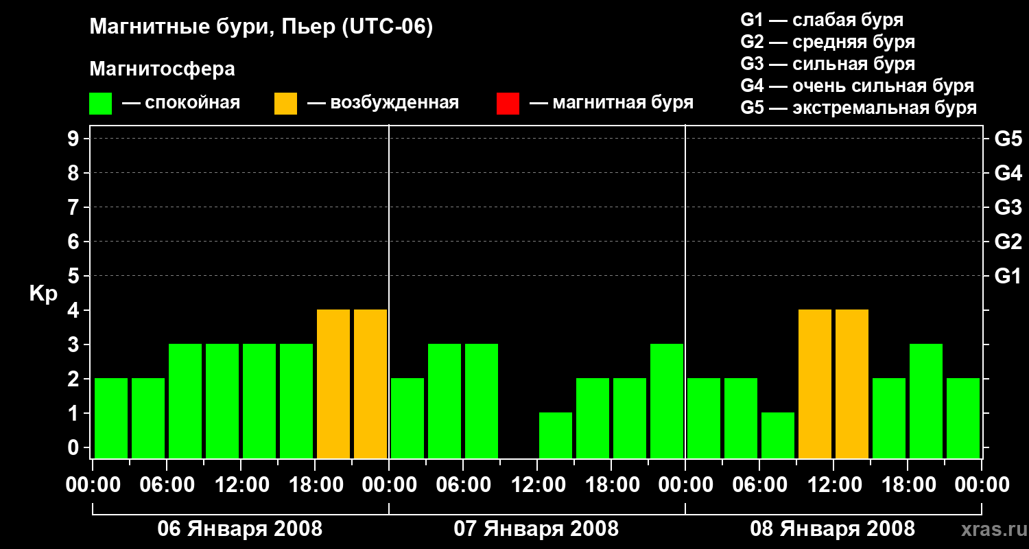 Изменения геомагнитного индекса Kp с 6 по 8 января 2008 года для средних широт