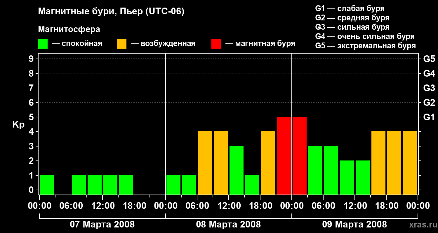 Изменения максимального суточного геомагнитного индекса Kp в марте 2008 года для средних широт