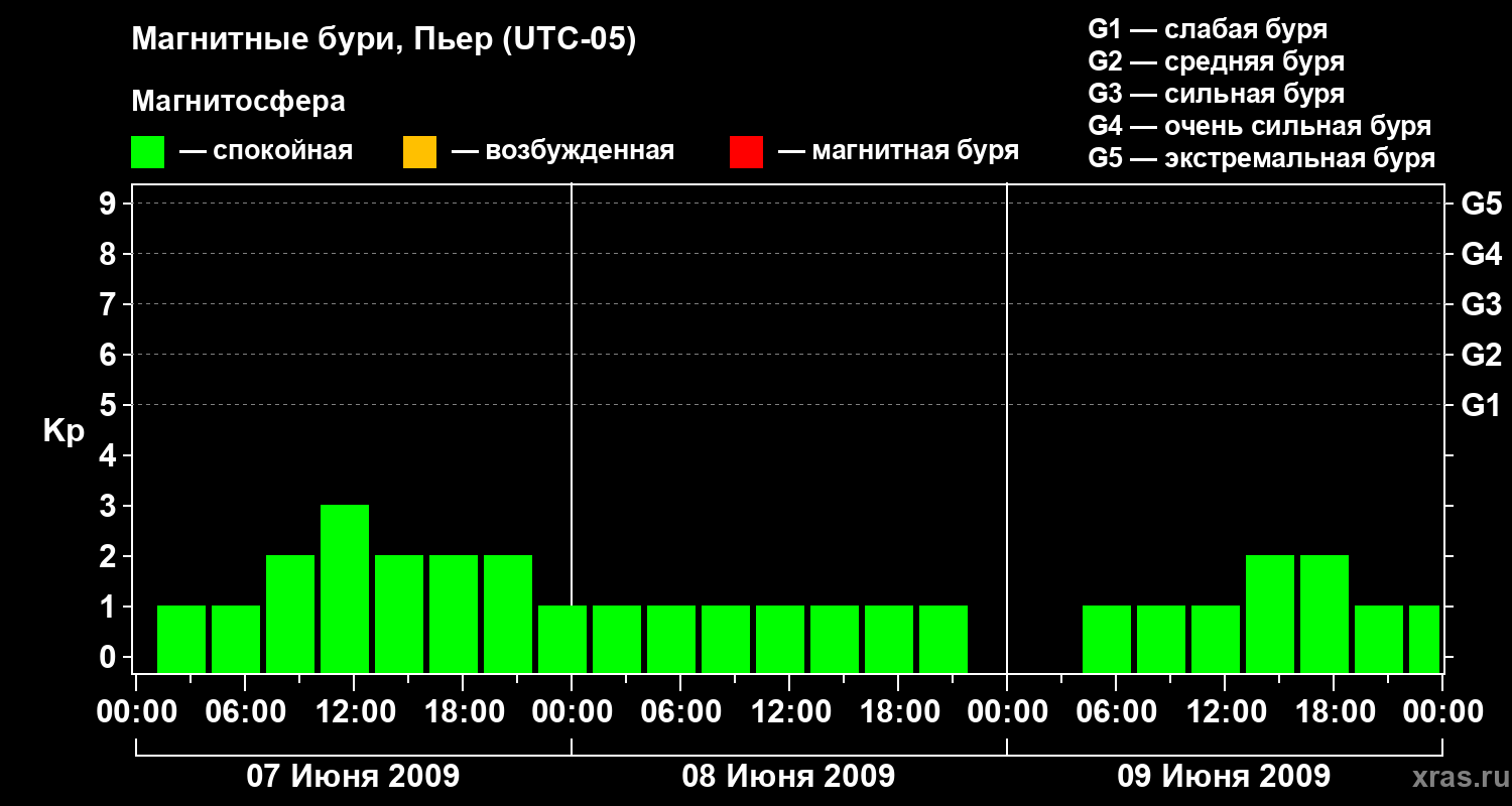 Изменения геомагнитного индекса Kp с 7 по 9 июня 2009 года для средних широт