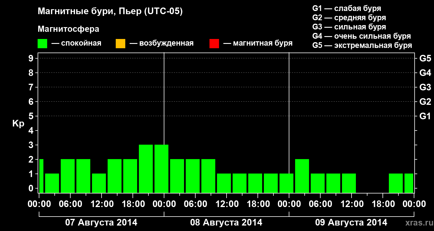 Изменения геомагнитного индекса Kp с 7 по 9 августа 2014 года для средних широт