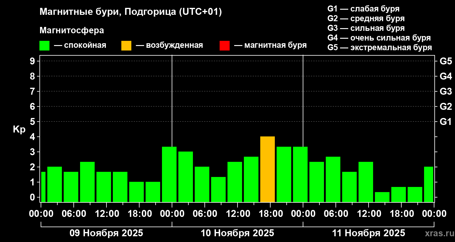 Магнитные бури в Подгорице — 11 ноября 2025 года