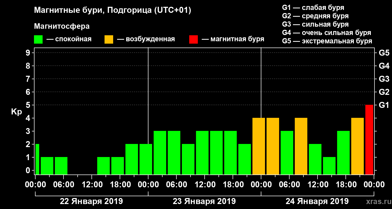 Изменения геомагнитного индекса Kp с 22 по 24 января 2019 года для средних широт