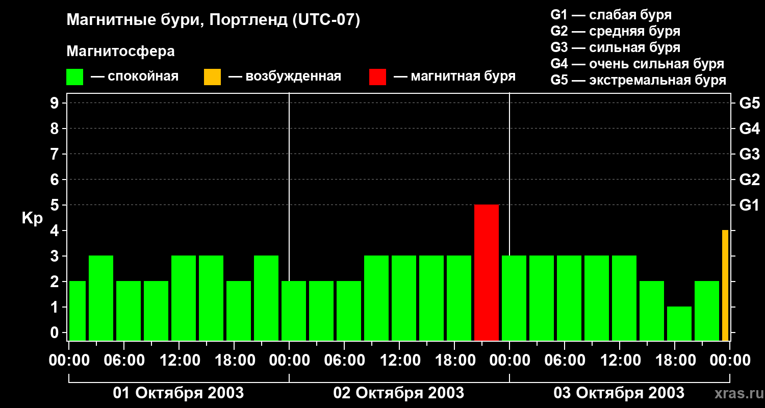 Изменения геомагнитного индекса Kp с 1 по 3 октября 2003 года для средних широт