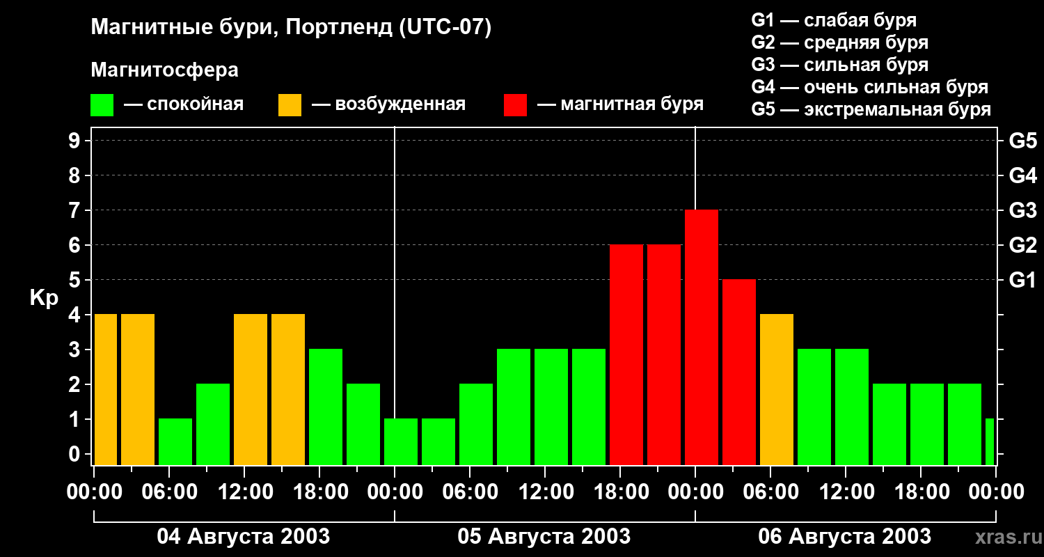 Изменения геомагнитного индекса Kp с 4 по 6 августа 2003 года для средних широт
