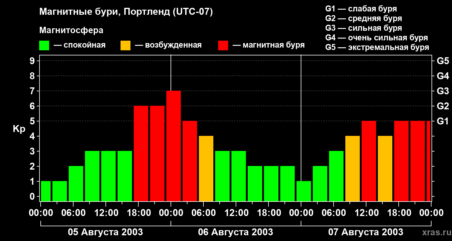 Изменения геомагнитного индекса Kp с 5 по 7 августа 2003 года для средних широт