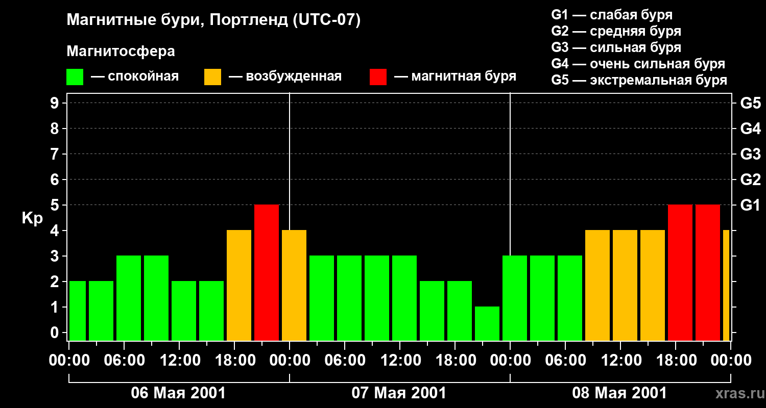 Изменения геомагнитного индекса Kp с 6 по 8 мая 2001 года для средних широт