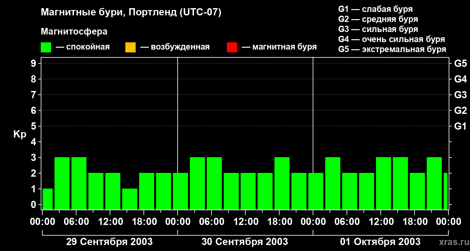 Изменения геомагнитного индекса Kp с 29 сентября по 1 октября 2003 года для средних широт