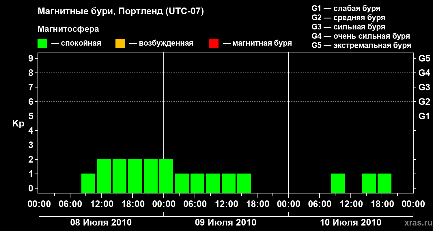 Изменения геомагнитного индекса Kp с 8 по 10 июля 2010 года для средних широт