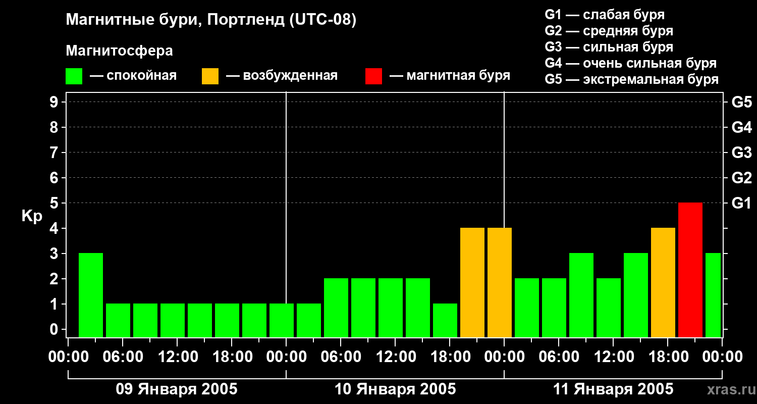 Изменения геомагнитного индекса Kp с 9 по 11 января 2005 года для средних широт