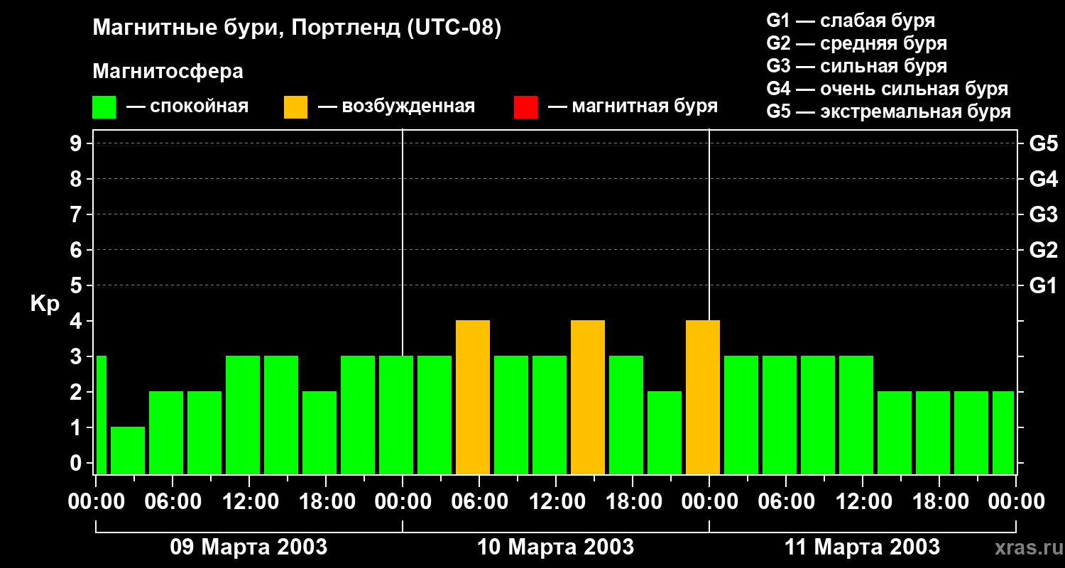 Изменения геомагнитного индекса Kp с 9 по 11 марта 2003 года для средних широт