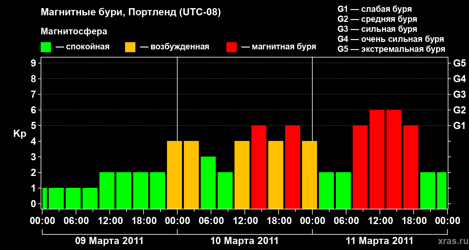 Изменения геомагнитного индекса Kp с 9 по 11 марта 2011 года для средних широт