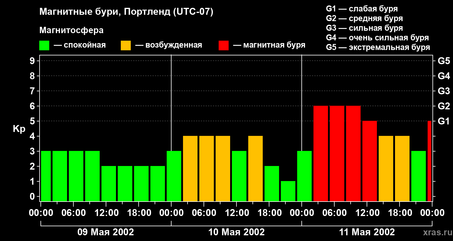 Изменения геомагнитного индекса Kp с 9 по 11 мая 2002 года для средних широт