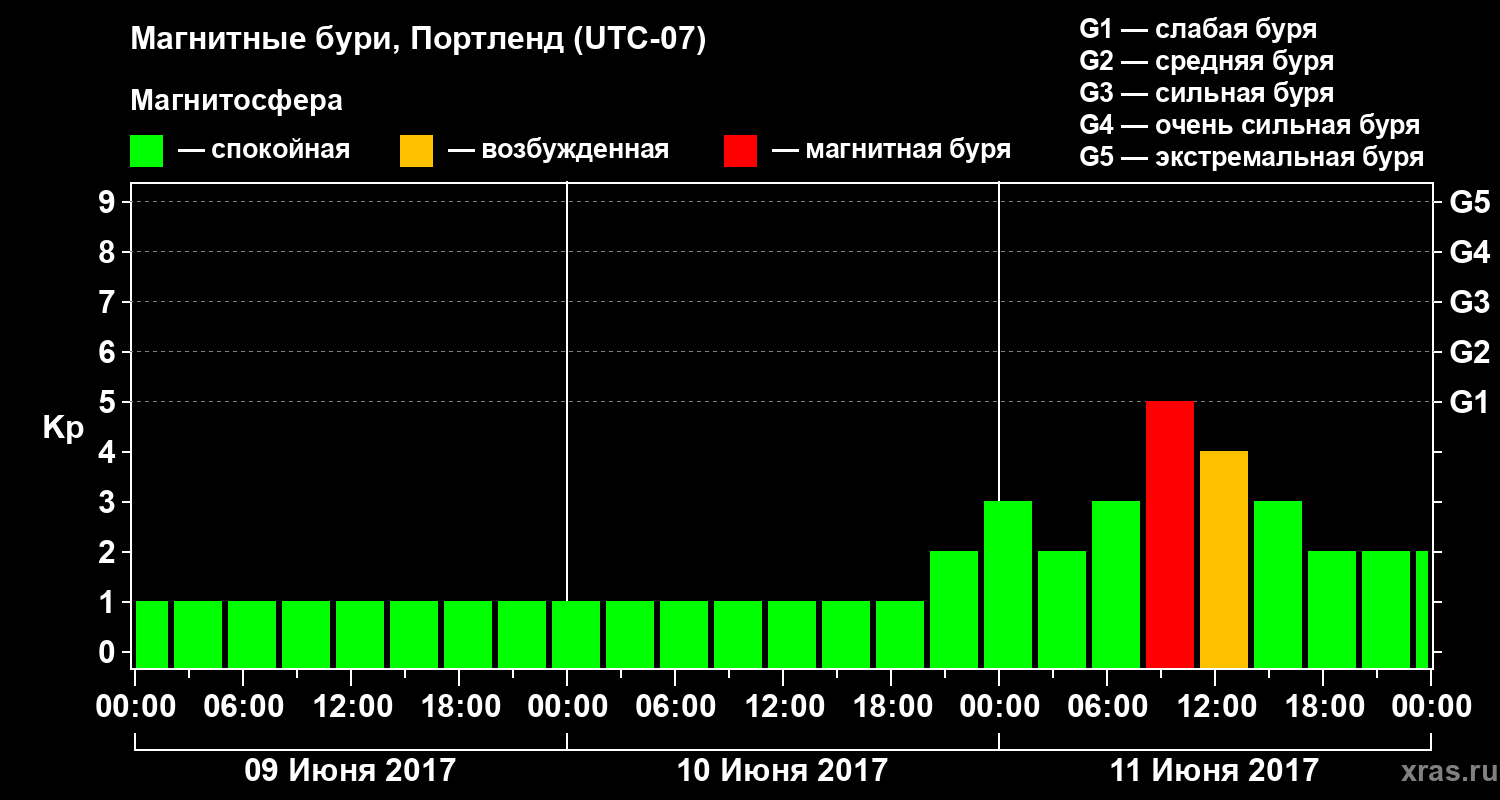 Изменения геомагнитного индекса Kp с 9 по 11 июня 2017 года для средних широт