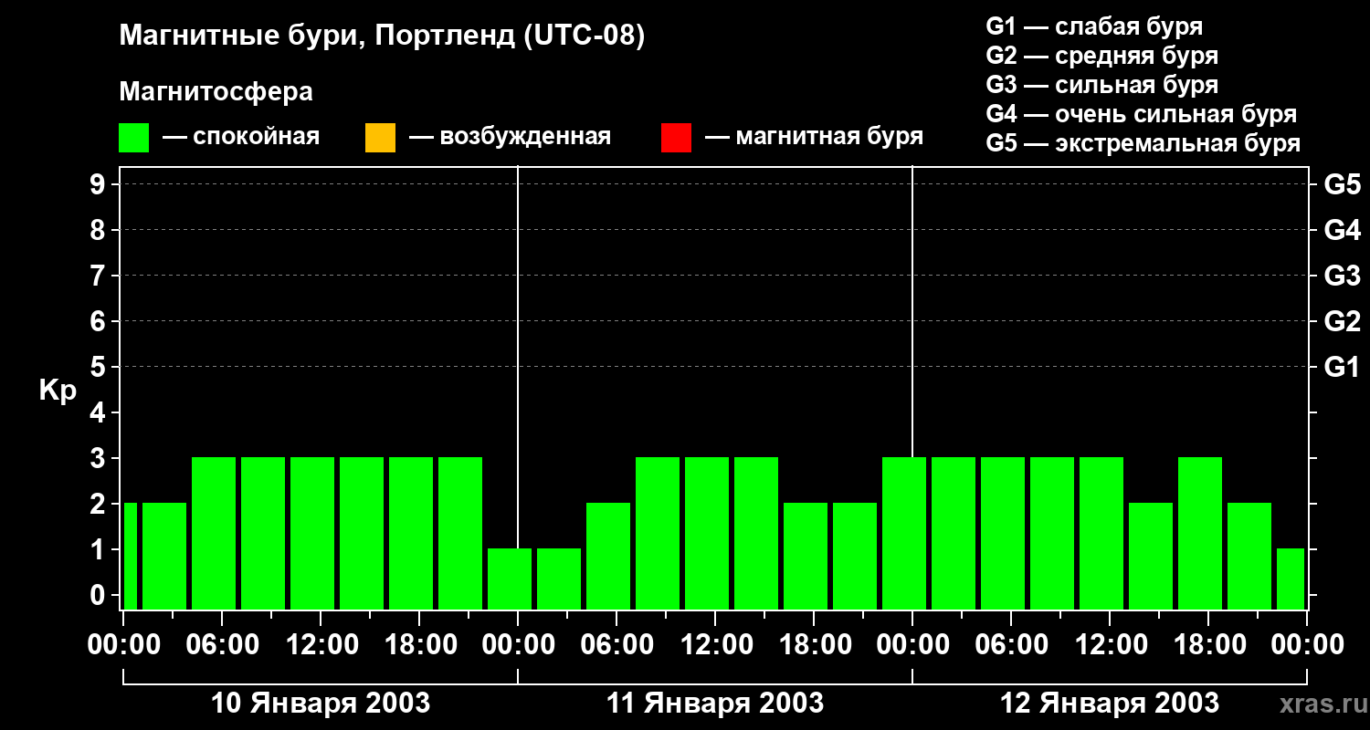 Изменения геомагнитного индекса Kp с 10 по 12 января 2003 года для средних широт