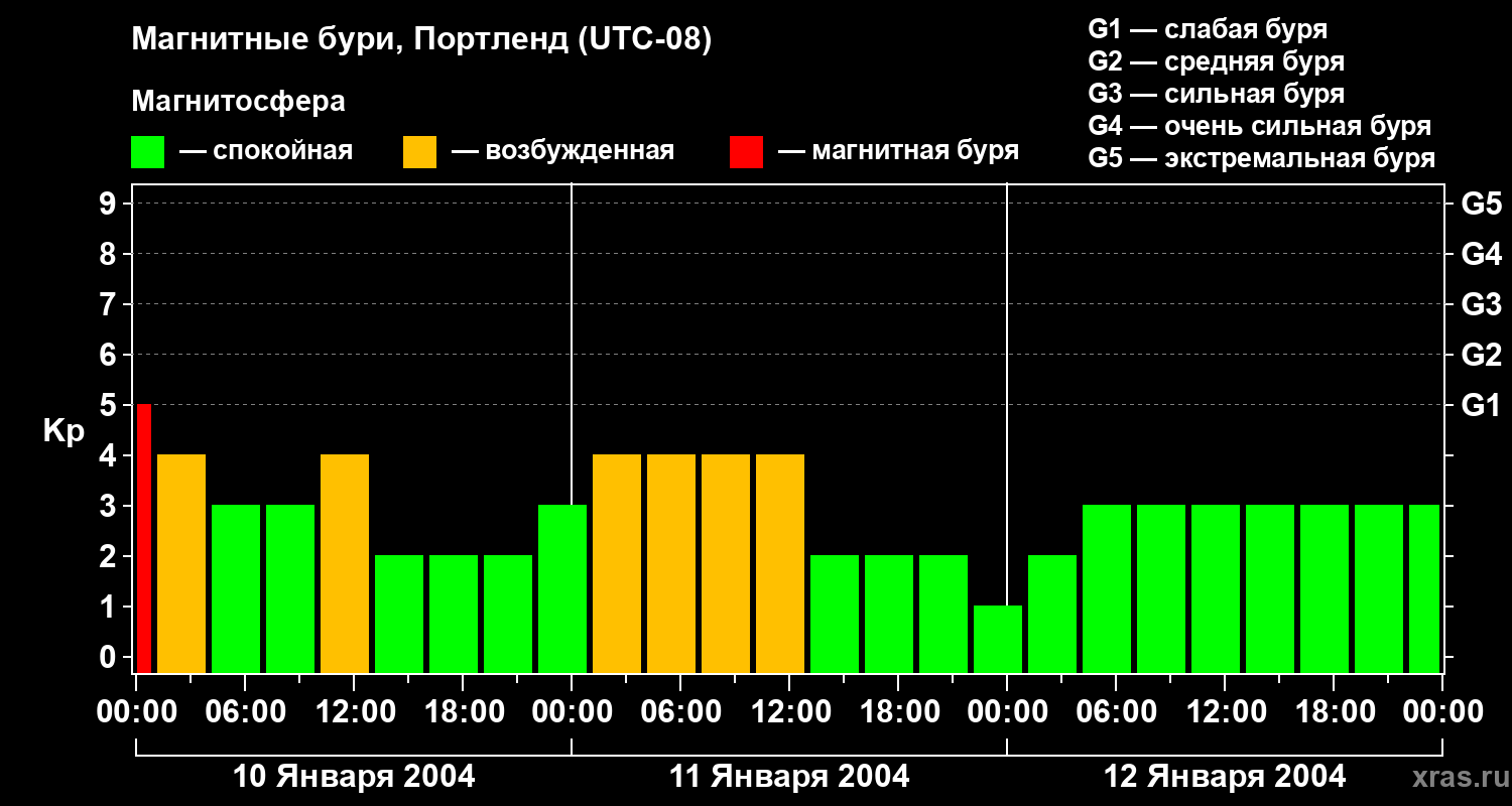 Изменения геомагнитного индекса Kp с 10 по 12 января 2004 года для средних широт
