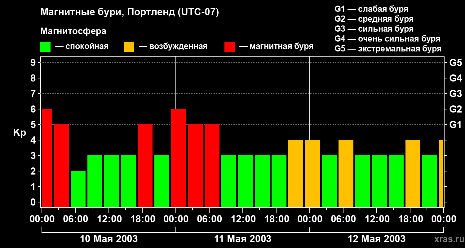 Изменения геомагнитного индекса Kp с 10 по 12 мая 2003 года для средних широт
