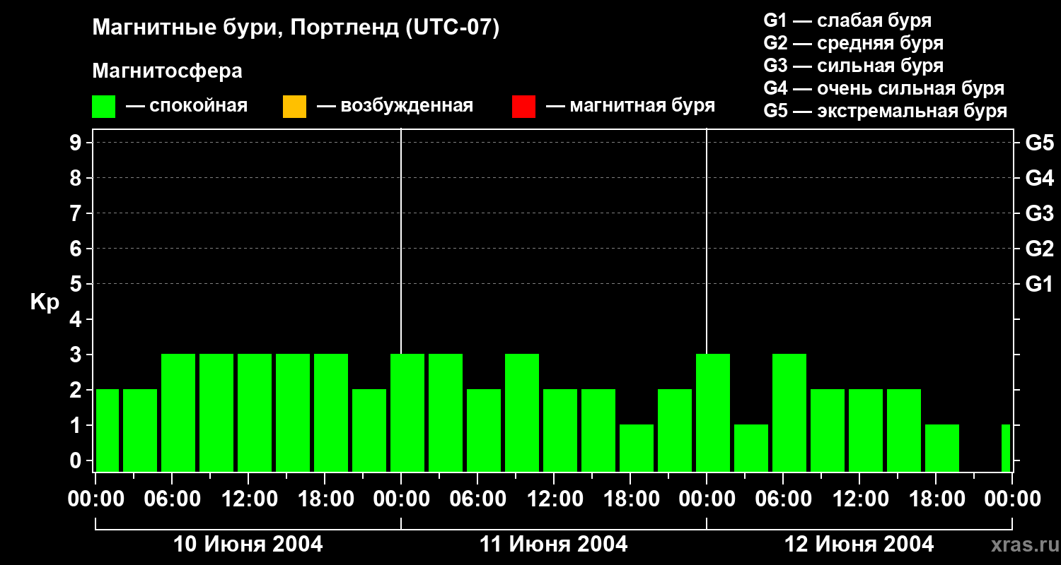Изменения геомагнитного индекса Kp с 10 по 12 июня 2004 года для средних широт