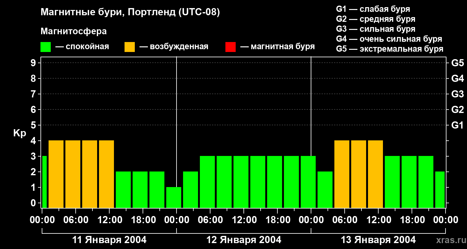 Изменения геомагнитного индекса Kp с 11 по 13 января 2004 года для средних широт
