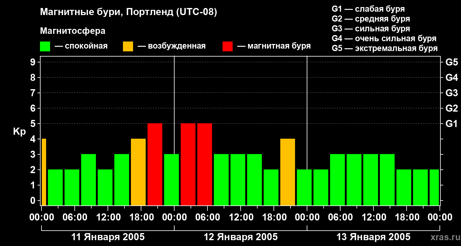 Изменения геомагнитного индекса Kp с 11 по 13 января 2005 года для средних широт