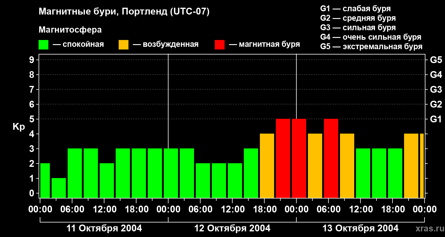Изменения геомагнитного индекса Kp с 11 по 13 октября 2004 года для средних широт