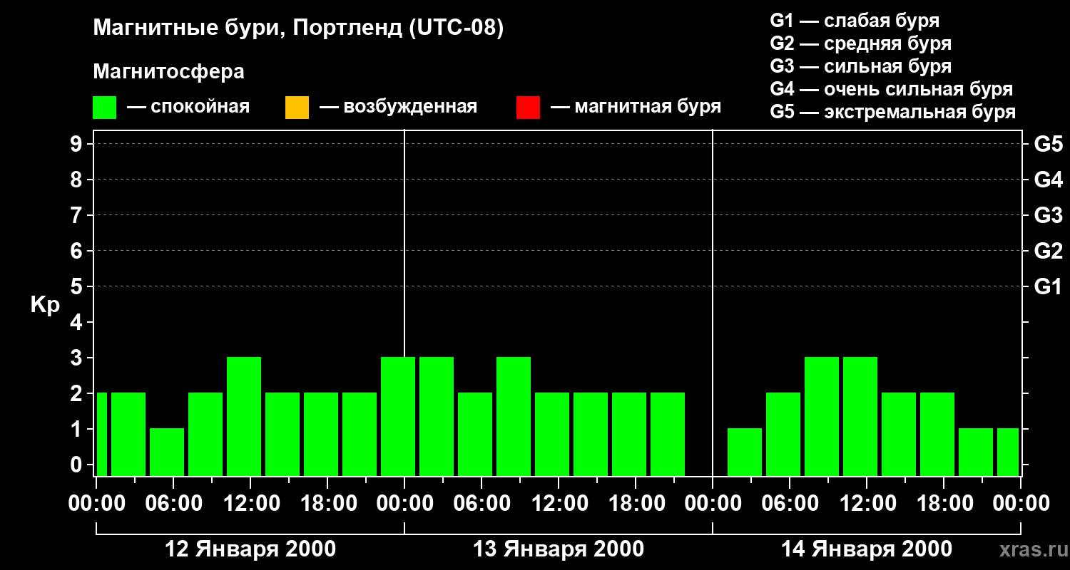 Изменения геомагнитного индекса Kp с 12 по 14 января 2000 года для средних широт