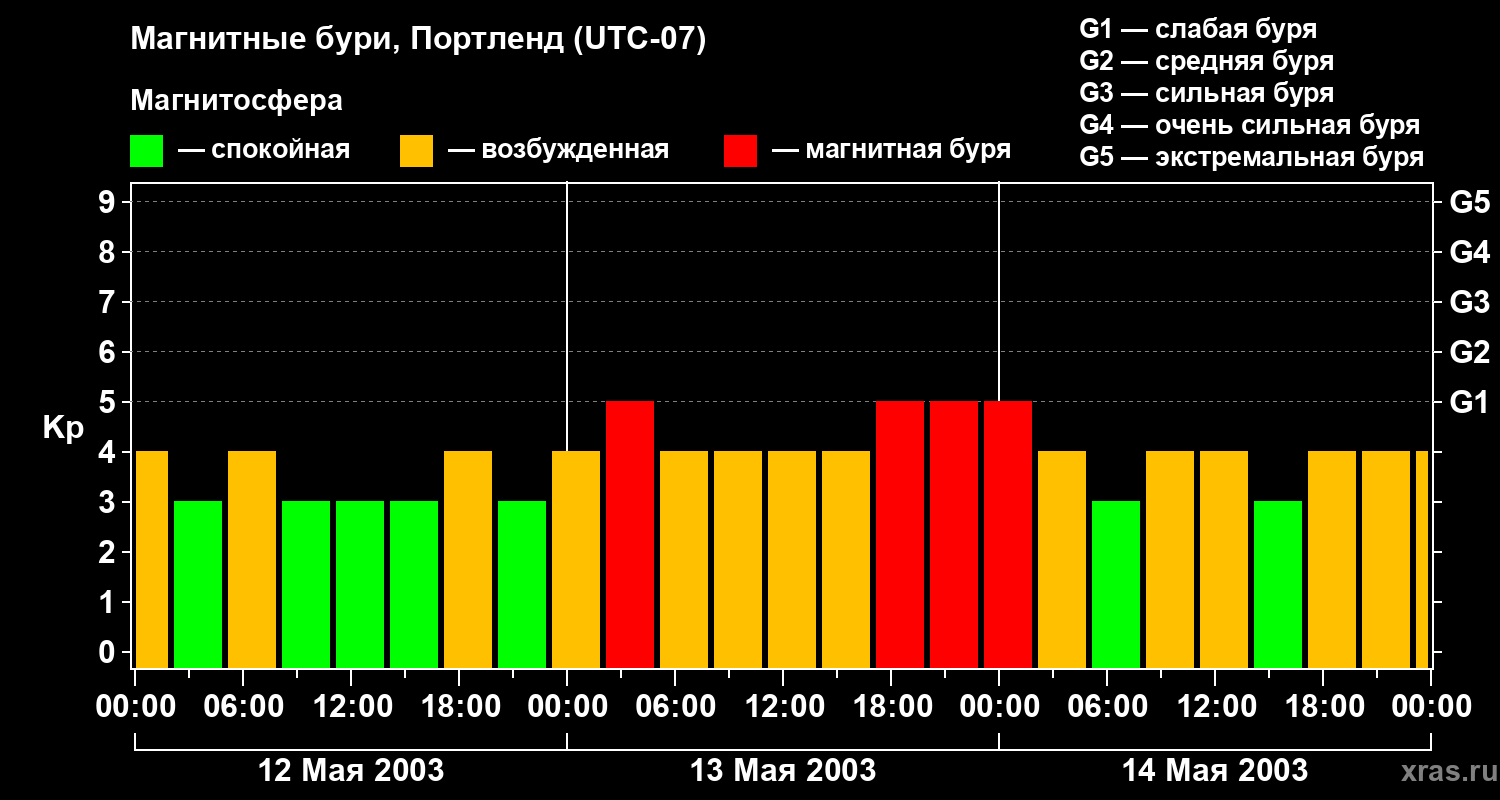 Изменения геомагнитного индекса Kp с 12 по 14 мая 2003 года для средних широт