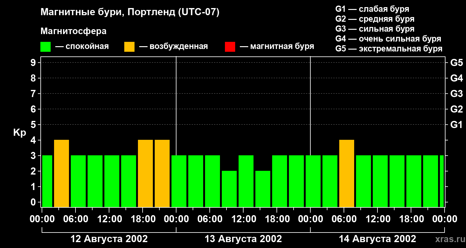 Изменения геомагнитного индекса Kp с 12 по 14 августа 2002 года для средних широт