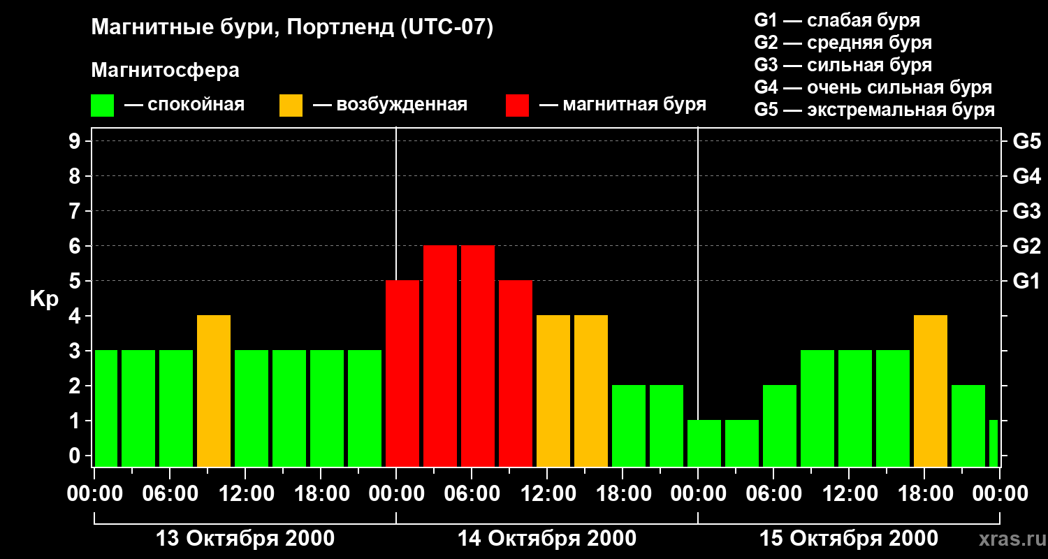 Изменения геомагнитного индекса Kp с 13 по 15 октября 2000 года для средних широт