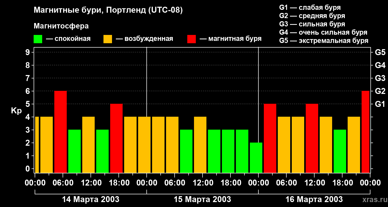 Изменения геомагнитного индекса Kp с 14 по 16 марта 2003 года для средних широт