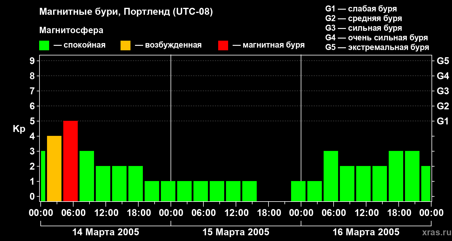 Изменения геомагнитного индекса Kp с 14 по 16 марта 2005 года для средних широт