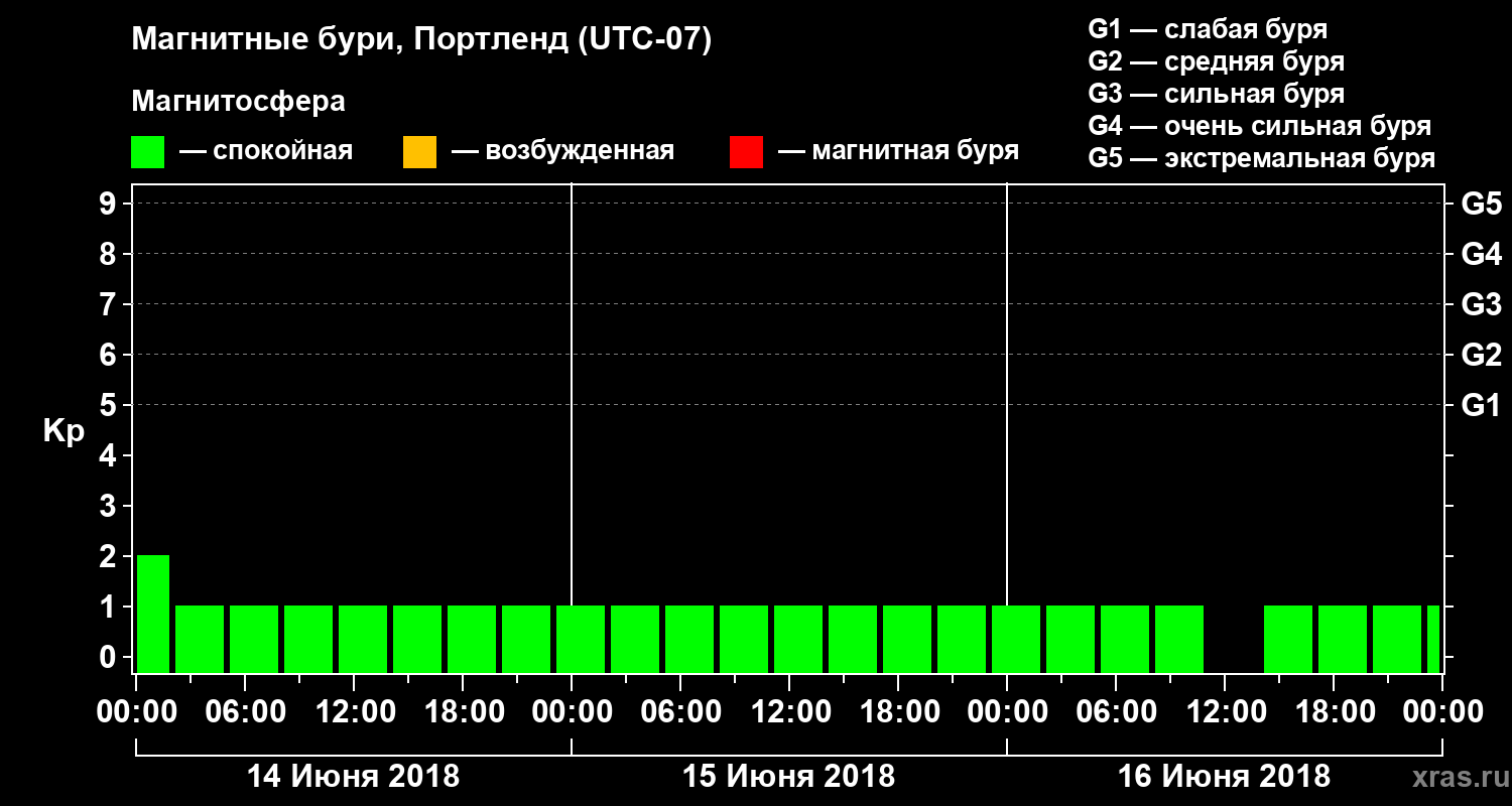 Изменения геомагнитного индекса Kp с 14 по 16 июня 2018 года для средних широт