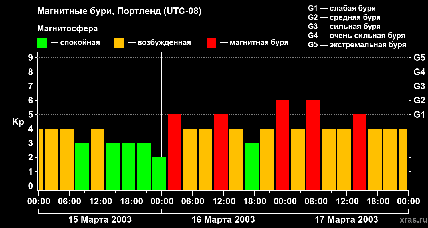 Изменения геомагнитного индекса Kp с 15 по 17 марта 2003 года для средних широт