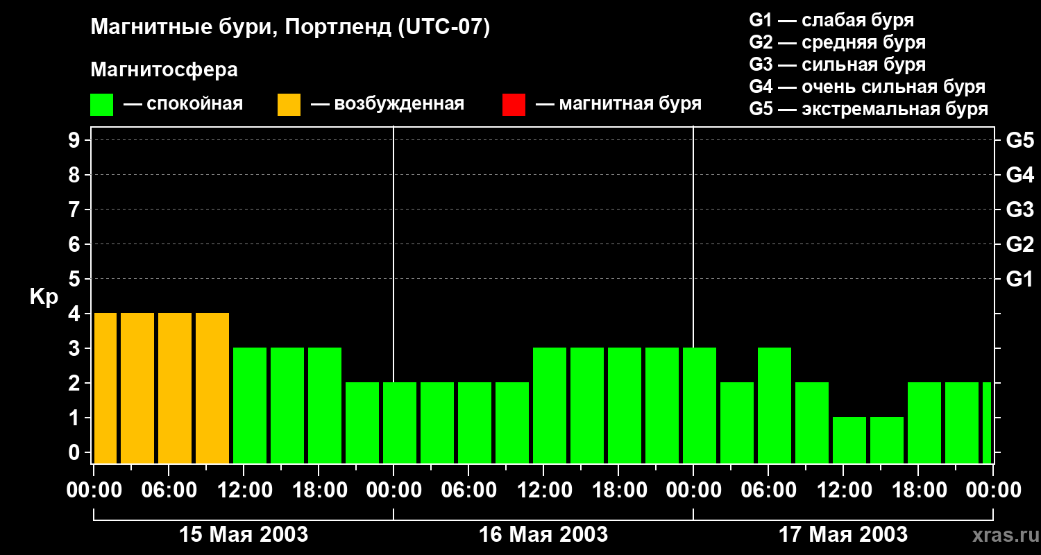 Изменения геомагнитного индекса Kp с 15 по 17 мая 2003 года для средних широт